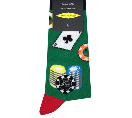 Poker Cards & Chips Cartoon Socks, Fun Novelty Unisex 360 Degree Artwork Character Designed Crew Socks